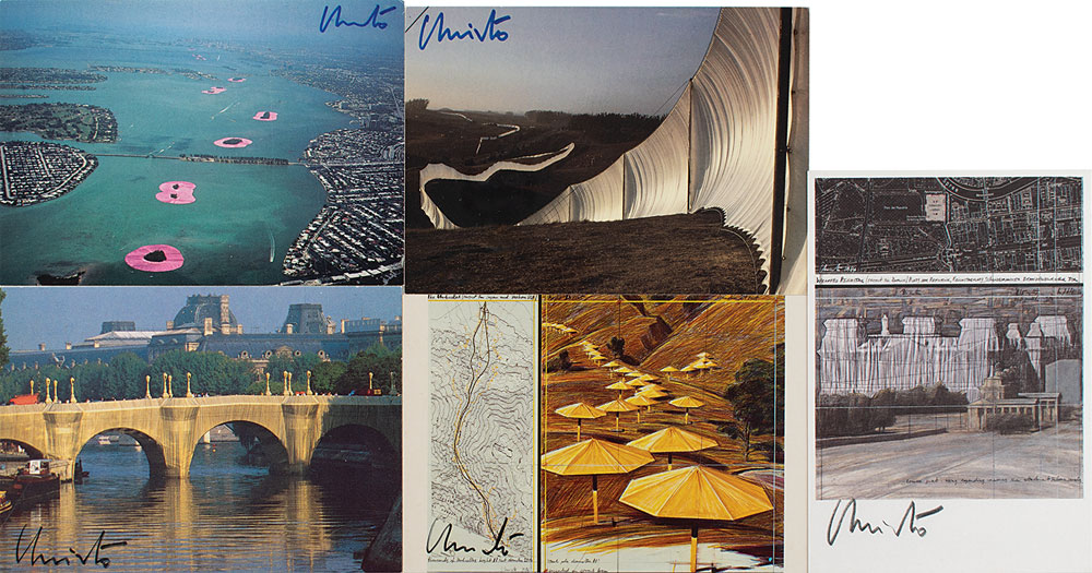 Artist (born 1935) known for his large-scale outdoor works made in collaboration with his wife Jeanne-Claude, including 'Running Fence' and 'The Gates.' Collection of five 6 x 4 postcards depicting different installations, each signed on the front in felt tip, "Christo." The subjects include: 'Running Fence,' 'Surrounded Islands,' 'The Umbrellas,' 'The Point Neuf Wrapped,' and 'Wrapped Reichstag.' In overall fine condition.