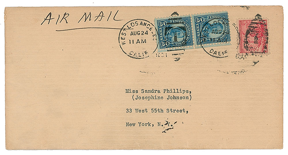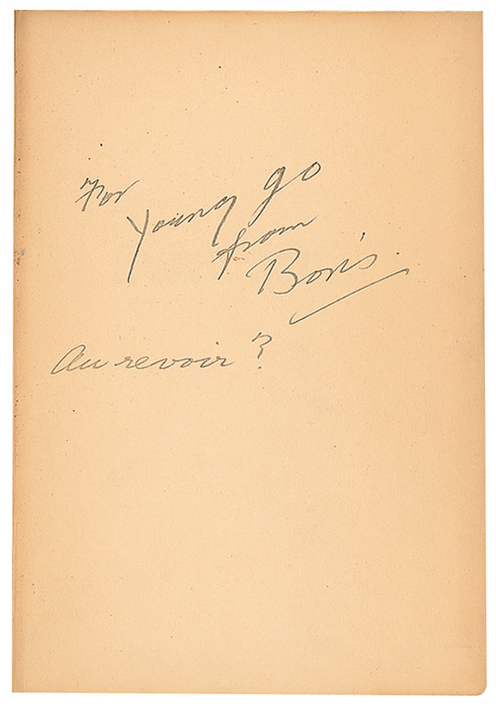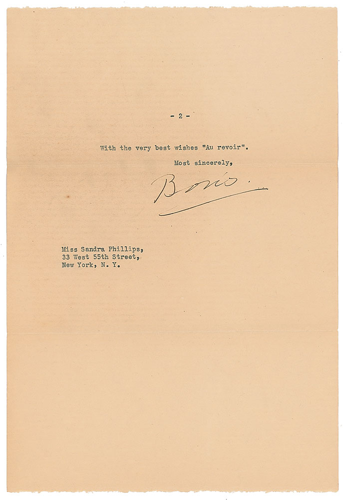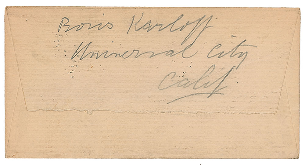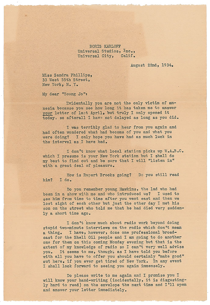 Two items: a TLS, signed “Boris,” one page, both sides, 7 x 10.25, personal stationery, August 22, 1934, written to Sandra Phillips, whom Karloff addresses as “Young Jo,” in part: “I don’t know much about radio work beyond doing stupid two-minute interviews on the radio which don’t mean a thing. I have, however, done one professional broadcast for the Shell Oil people and I am going to do another one for them on this coming Monday evening but that is the extent of my knowledge of radio so I can’t very well advise you. It seems to me, though, as I have told you before with all you have to offer you should certainly ‘make good’ out here, if you ever get tired of New York. In any event I shall look forward to seeing you again immensely”; and a hardcover copy of The Collected Poems of Rupert Brooke, published by Dodd, Mead and Company in 1915, signed and inscribed on the first free end page in fountain pen, “For Young Jo, from Boris, Au revoir?” Also included is the letter’s original mailing envelope, postmarked August 24, 1934, with Karloff incorporating his signature in the return address on the reverse in pencil: “Boris Karloff, Universal City, Calif.” In overall very good to fine condition, with blocks of light toning to the first page of the letter, some damage to the spine of the book, and the book's cover and first few pages (including the signed page) completely detached but present.