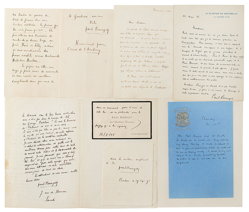 French novelist, poet, and critic (1852-1935) who was nominated for the Nobel Prize in Literature five times. Collection of five ALSs by Paul Bourget, plus an ink signature and one of his personal calling cards with a handwritten note. One letter, in part (translated): "Your word arrives here and I come immediately to tell you that I do not know anyone or correspondent. If you are in touch with him, you could ask for his support from my colleague, the Marquis de Vogue, who I believe is chairman of the board of directors. For the Revue des deux mondes it seems to me that a personal approach with Mr. Rene Doumic, and a manuscript delivery in his hands would be the most effective procedure. I do not yet know the exact date of my return, but you have no doubt that I am not ready to support you with my influence. Unfortunately, it is very small. Madame Bourget asks me not to forget it with you." Another letter, written in English in the third-person, in part: "Mr. Paul Bourget sends Mr. Lincoln his thanks for his amiable note. Being extremely busy during these days, it would be difficult for him to give an appointment which he could not be sure of keeping exactly. He would be very much obliged to M. Lincoln for explaining by letter the matter he refers to and adds here his best compliments." In overall fine condition. Accompanied by a four-page manuscript in another hand about Bourget and George Alexander, who acquired the rights to Bourget's play Le Tribun.