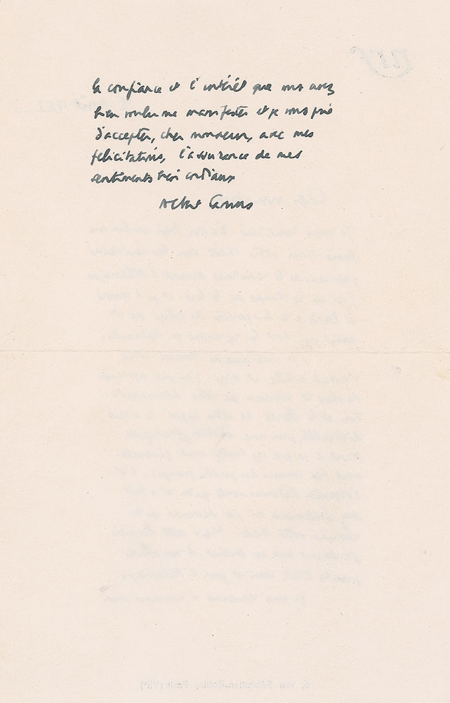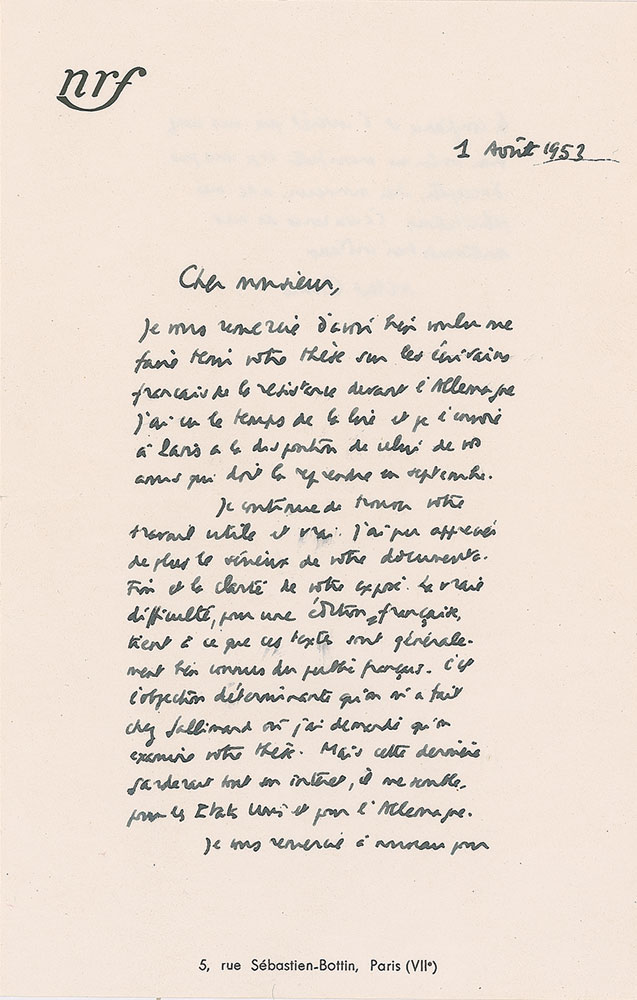 ALS in French, one page both sides, 5.25 x 8.25, NRF letterhead, August 1, 1953. Letter to a gentleman, in part (translated): "I thank you for letting me have your thesis on French writers of the Resistance against the Germans. I took the time to read it and I am sending it on to Paris to the attention of that friend of yours who is supposed to pick it up in September. I keep on finding your work useful and true. In addition I was able to appreciate the seriousness of your documentation and the clarity of your argument. The true difficulty, for its publication in French, comes from the fact that the French are generally very familiar with those texts. It is the determining objection that was raised at Gallimard where I requested that your thesis be reviewed. But it seems to me that the work's interest would remain intact for the United States or Germany." In fine condition.