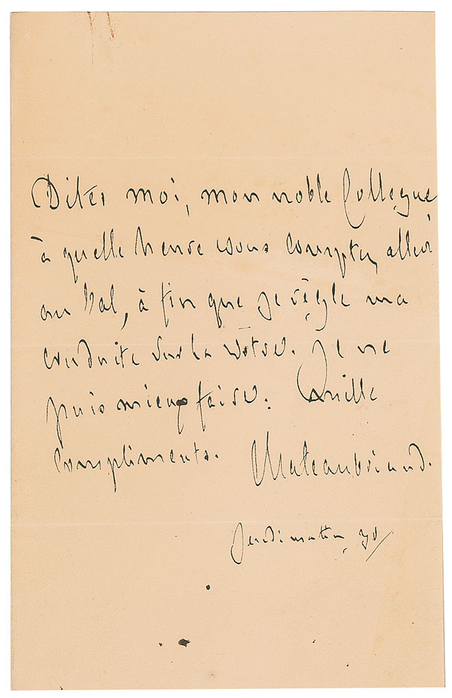 Writer, politician, diplomat, and historian (1768-1848) considered the founder of Romanticism in French literature. ALS in French, signed “Chateaubriand,” one page, 4.5 x 7.25, no date. Letter to a friend, in full (translated): "Tell me, my dear Colleague, what time you wish to go to the ball, so that I may be ready. I cannot do any better." In fine condition.