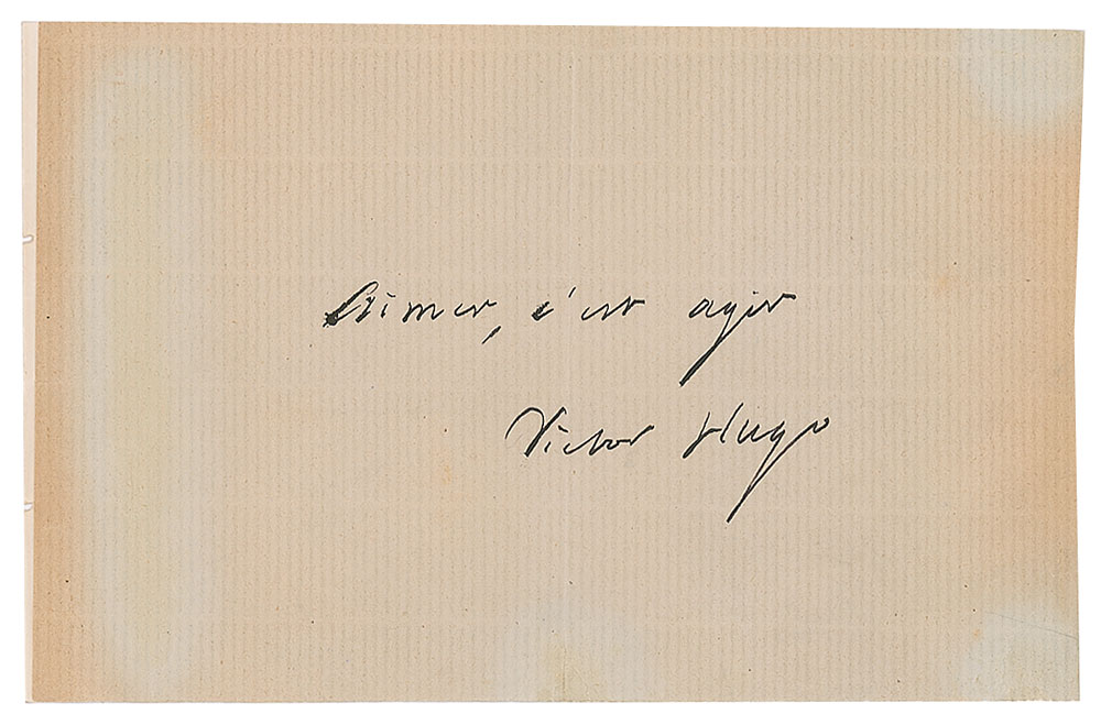 Boldly penned AQS on an 8 x 5.25 sheet, in full: "Aimer, c'est agir [To love is to act], Victor Hugo." Affixed to a same-size sheet and in very good to fine condition, with some light toning, and two tears to the bottom edge.
