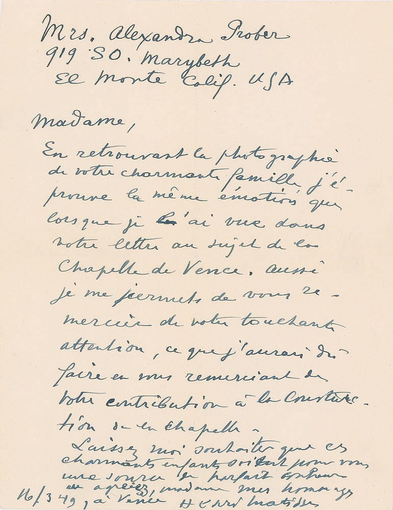 ALS in French, one page, 8 x 10.5, March 16, 1949. Letter to Mrs. Alexander Prober, in full (translated): "In again finding the photograph of your charming family, I experienced the same emotion as when I saw it in your letter on the subject of the 'Chapelle de Vence.' Also, I permit myself to thank you for your touching attention, which I should have done in thanking you for your contribution to the construction of the chapel. Allow me to wish that these charming children will be for you a source of perfect happiness and accept, Madame, my deep respects." In fine condition. The Chapelle du Rosaire de Vence (Chapel of the Rosary), often referred to as the Matisse Chapel or the Vence Chapel, is a small Catholic chapel located in the town of Vence on the French Riviera. The church, which houses a number of Matisse originals, was built and decorated between 1947 and 1951 under a plan devised by Matisse, who has regarded the project as his 'masterpiece.'