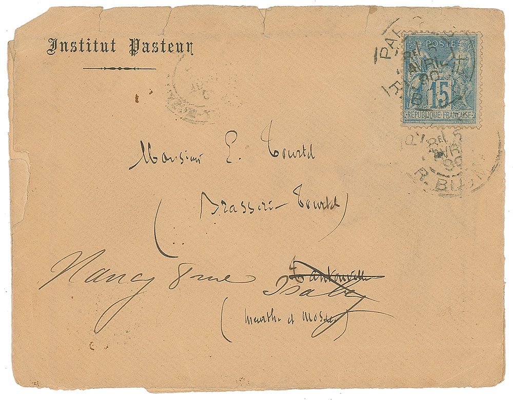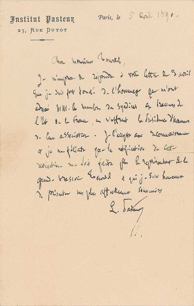 Superb ALS signed “L. Pasteur,” one page, 4.25 x 6.75, Institut Pasteur letterhead, April 5, 1890. Letter to brewer Prosper Tourtel, in full (translated): "I hasten to answer your letter of April 3rd, and I am very touched by the homage shown to me by all the members of the Brewers Syndicate of Eastern France, in offering me the honorary Presidency of their association. I accept with gratitude and bliss the notification has been given to me by the representative of the grand Tourtel brewery to whom I am sending my most affectionate regards." In fine condition. Accompanied by the original hand-addressed mailing envelope.