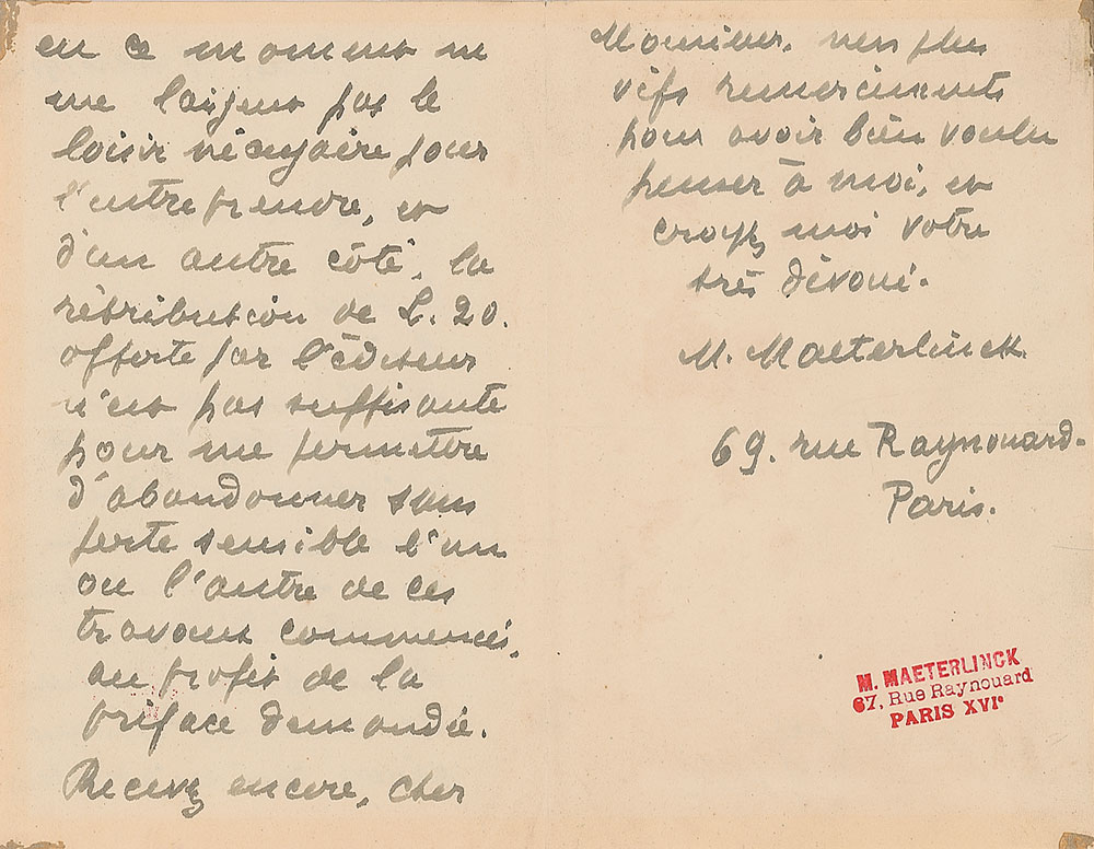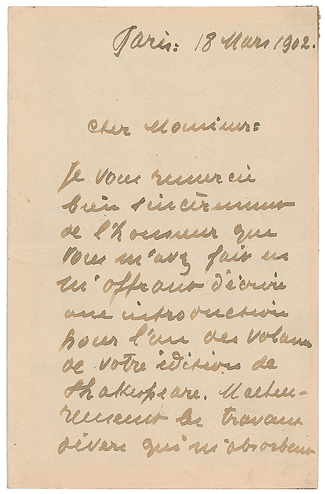 Belgian playwright, poet, and essayist (1862-1949) awarded the Nobel Prize in Literature in 1911. ALS in French, signed “M. Maeterlinck,” three pages on two adjoining sheets, 4.5 x 7, March 18, 1902. Letter concerning an "introduction to one of the volumes of your editions of Shakespeare." In fine condition, with light wrinkling. Accompanied by an unsigned portrait of the author.