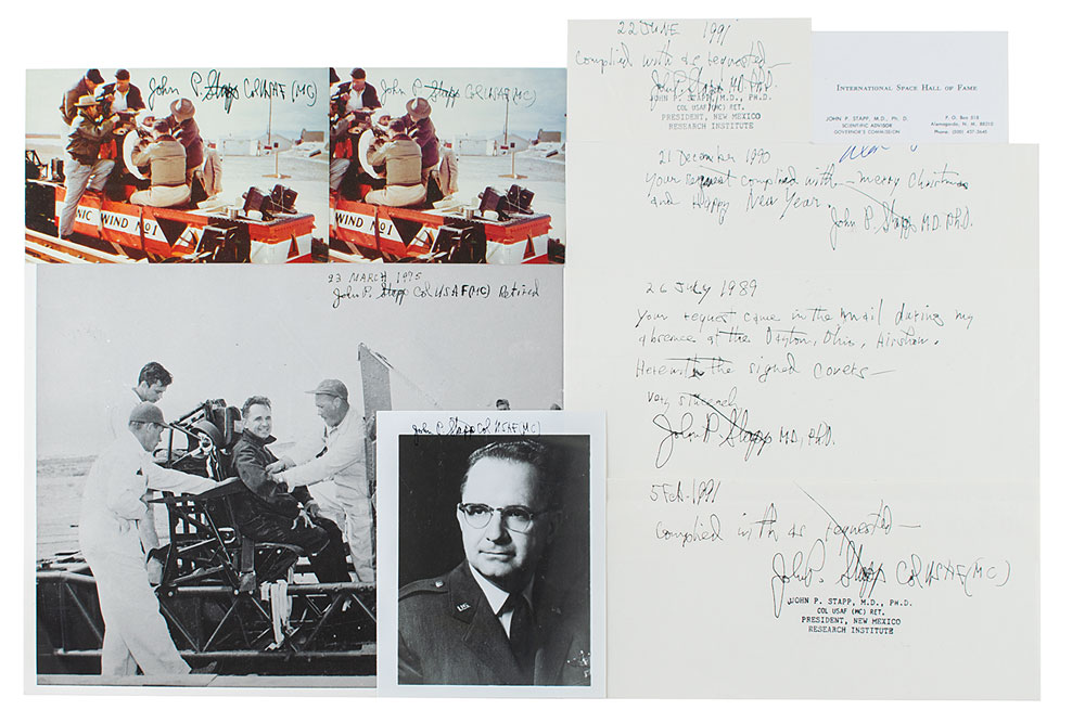 US Air Force officer (1910-1999), flight surgeon, physician, biophysicist, and pioneer in studying the effects of acceleration and deceleration forces on humans. His work on Project Manhigh pioneered many developments for the US space program. Eight items signed by Col. Stapp, including: a glossy 10 x 8 photo of Stapp in his rocket sled after setting a new land speed record in 1954, signed in black ink; two color 5.5 x 3.5 postcards of the Sonic Wind No. 1 rocket sled, both signed in black ink; a glossy 4 x 5 portrait of him in uniform, signed in black ink; and four brief handwritten notes by Stapp, replying to autograph requests. In overall fine condition. Accompanied by an unsigned example of Stapp's International Space Hall of Fame business card.