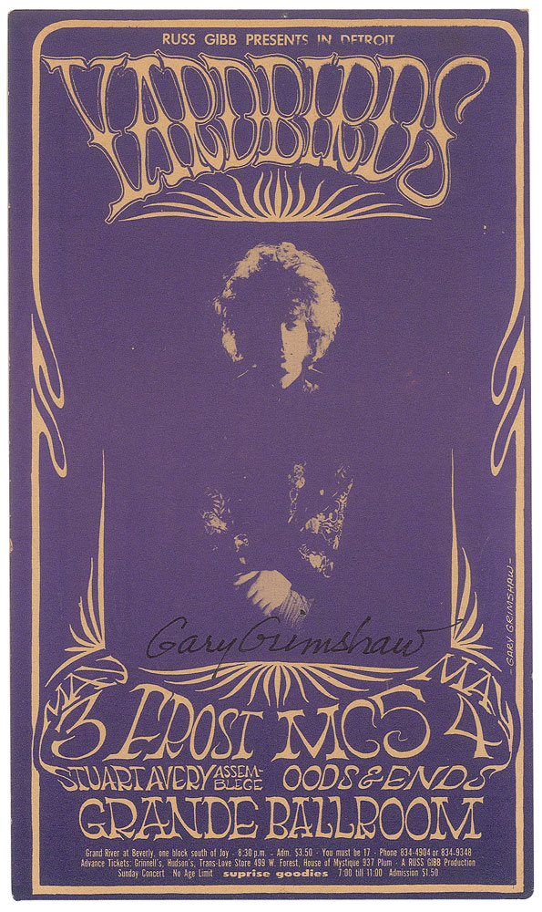 Vintage postcard of a poster promoting two concerts by The Yardbirds at the Grande Ballroom in Detroit, Michigan, on May 3 and 4, 1968, 4.25 x 7.25, signed in black ink by the poster designer Gary Grimshaw. The postcard features a central image of Jimmy Page, with supporting acts listed as Frost, MC5, the Stuart Avery Assemblage, and Odds & Ends. In fine condition.