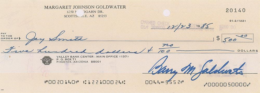 Personal check belonging to his late wife Margaret Johnson Goldwater, 8.25 x 3, filled out in another hand and signed by Goldwater, "Barry M. Goldwater," payable to Jay Smith for $500, December 23, 1985. In fine condition. Goldwater likely used this check to help settle the bills and debts of his late wife Margaret, who passed only 12 days earlier on December 11, 1985.