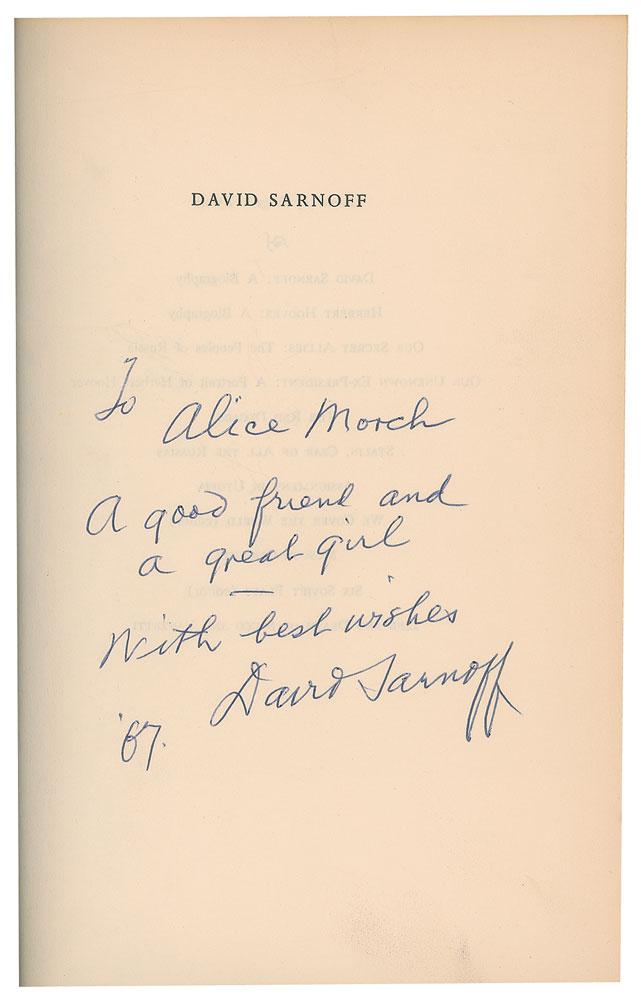 Russian-American businessman and pioneer of American radio and television (1891-1971) who ruled over an ever-growing telecommunications and media empire that included both RCA and NBC, and became one of the largest companies in the world. Signed book: David Sarnoff: A Biography by Eugene Lyons. First edition. NY: Harper & Row, 1966. Clothbound hardcover, 6.5 x 9.75, 372 pages. Signed and inscribed on the half-title page in black ballpoint, "To Alice Morch, a good friend and a great girl, with best wishes, David Sarnoff, '67." In fine condition.