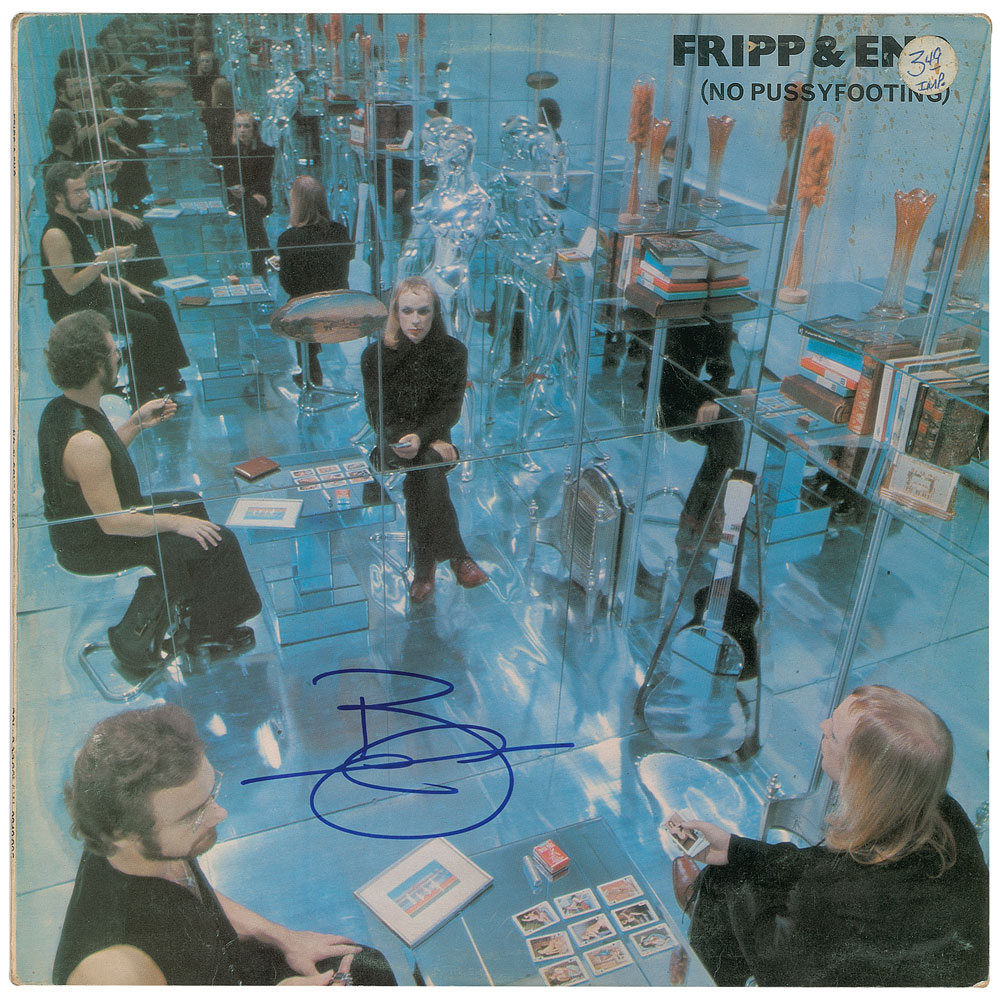 (No Pussyfooting) album by Fripp & Eno, signed on the front cover in blue felt tip by Brian Eno. In fine condition, with an affixed price sticker. The record is included. Accompanied by a John Brennan Collection letter of provenance. From The John Brennan In-person Autograph Collection.