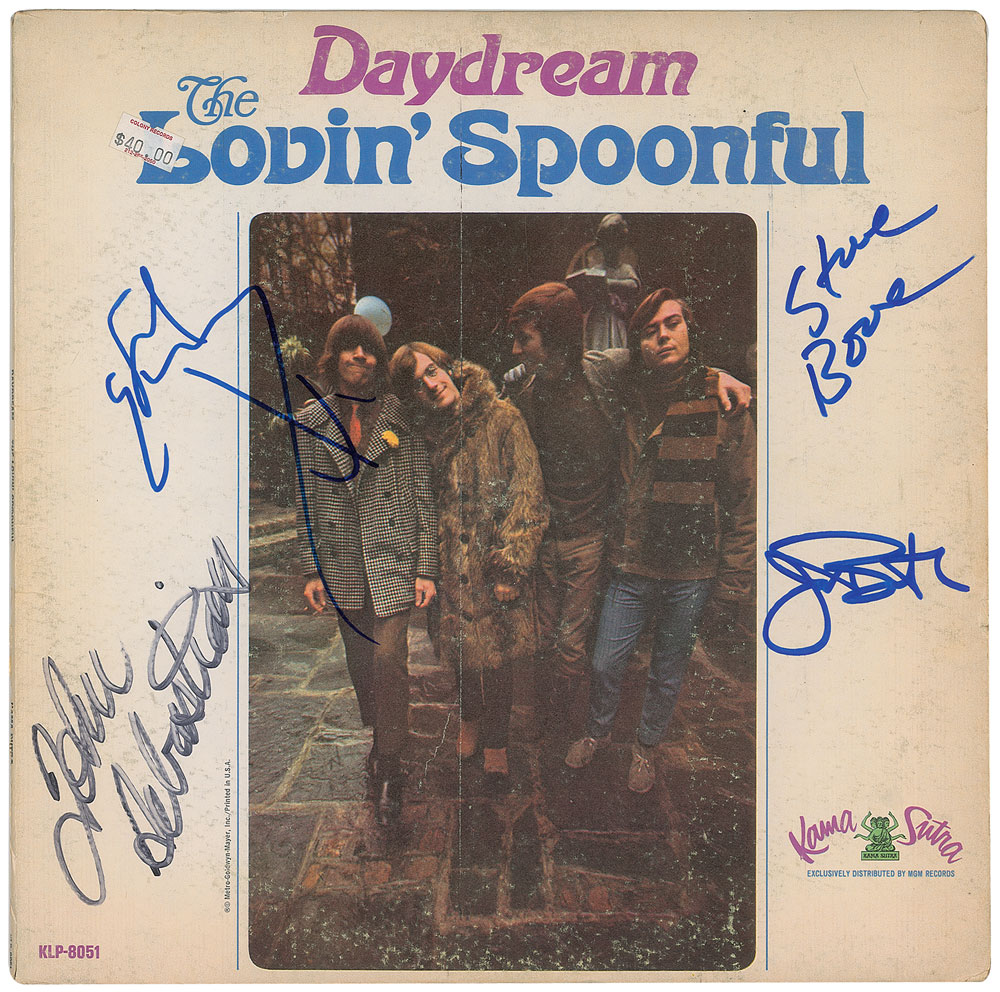 Daydream album by The Lovin' Spoonful, signed on the front cover in black felt tip by John Sebastian, and in blue felt tip by Joe Butler, Steve Boone, and Zal Yanovsky. In fine condition, with light scuffing and an affixed price sticker. The record is included. Accompanied by a John Brennan Collection letter of provenance. From The John Brennan In-person Autograph Collection.