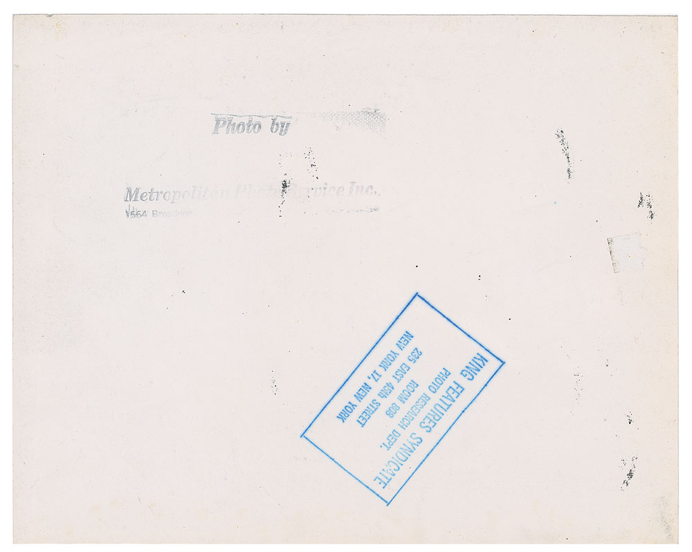 Sharp original vintage glossy 7.5 x 9.5 silver gelatin photo of Marilyn Monroe and husband Arthur Miller posing side-by-side, dressed in their winter coats. Reverse bears Metropolitan Photo Service and King Features Syndicate credit stamps. In fine condition, with trimmed edges and a couple trivial creases to the top edge.