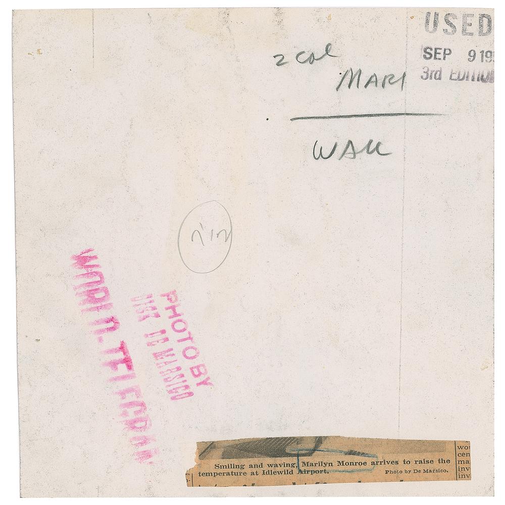 Original vintage glossy 6.5 x 8.5 silver gelatin photo of Marilyn Monroe glamorously descending the steps of a plane at Idlewild Airport. Reverse bears a Dick DeMarsico/World-Telegram credit stamp and affixed caption. In fine condition, with trimmed edges and a light vertical impression to the left side.