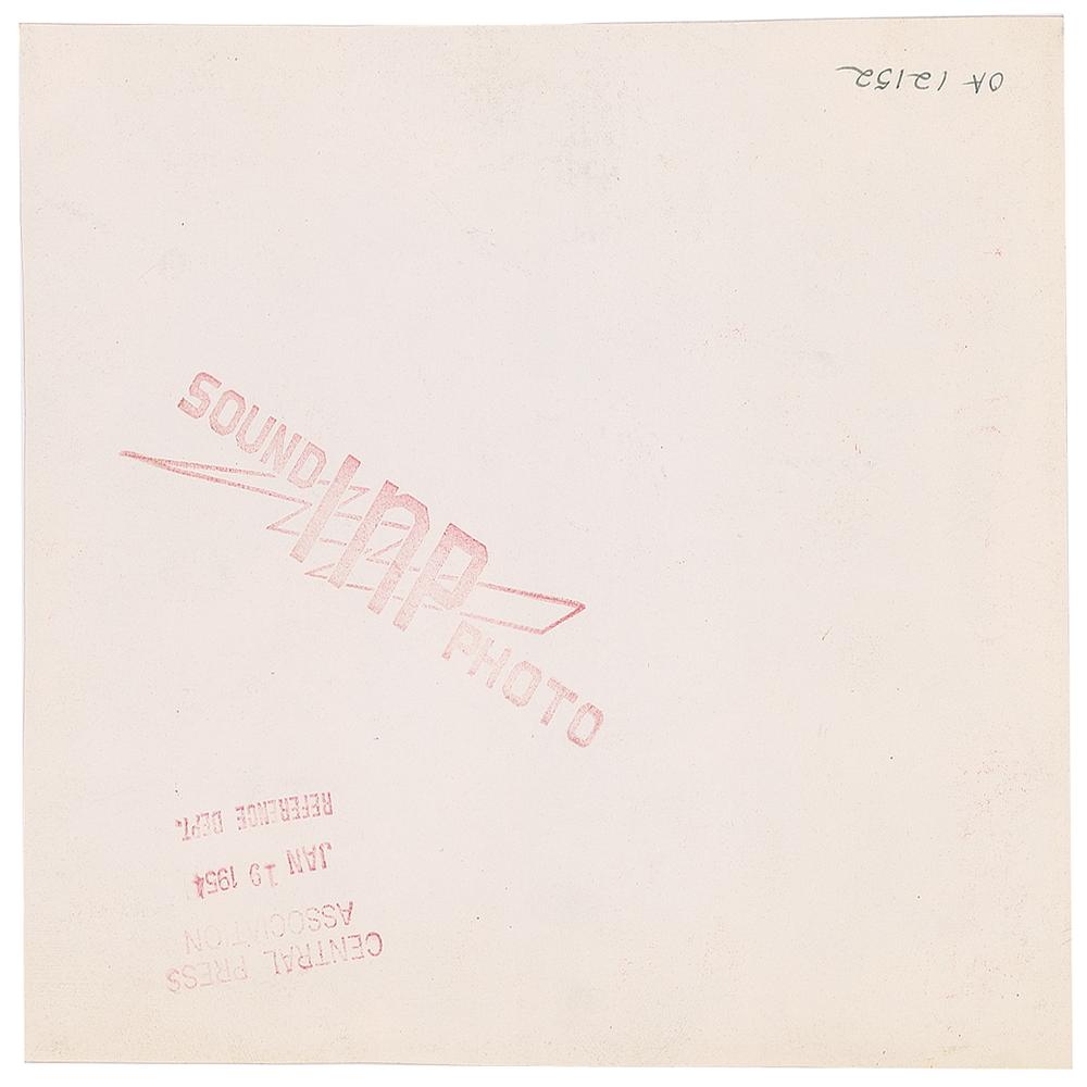 Original vintage glossy 7.5 x 6.75 silver gelatin photo of Marilyn Monroe and Joe DiMaggio in the judge's chambers for their marriage ceremony on January 14, 1954. Reverse is stamp-dated January 14, 1954, and bears Central Press Association/Sound INP Photo credit stamps. In fine condition, with a spot of surface loss above DiMaggio's head. A fabulous image of the ecstatic newlyweds.