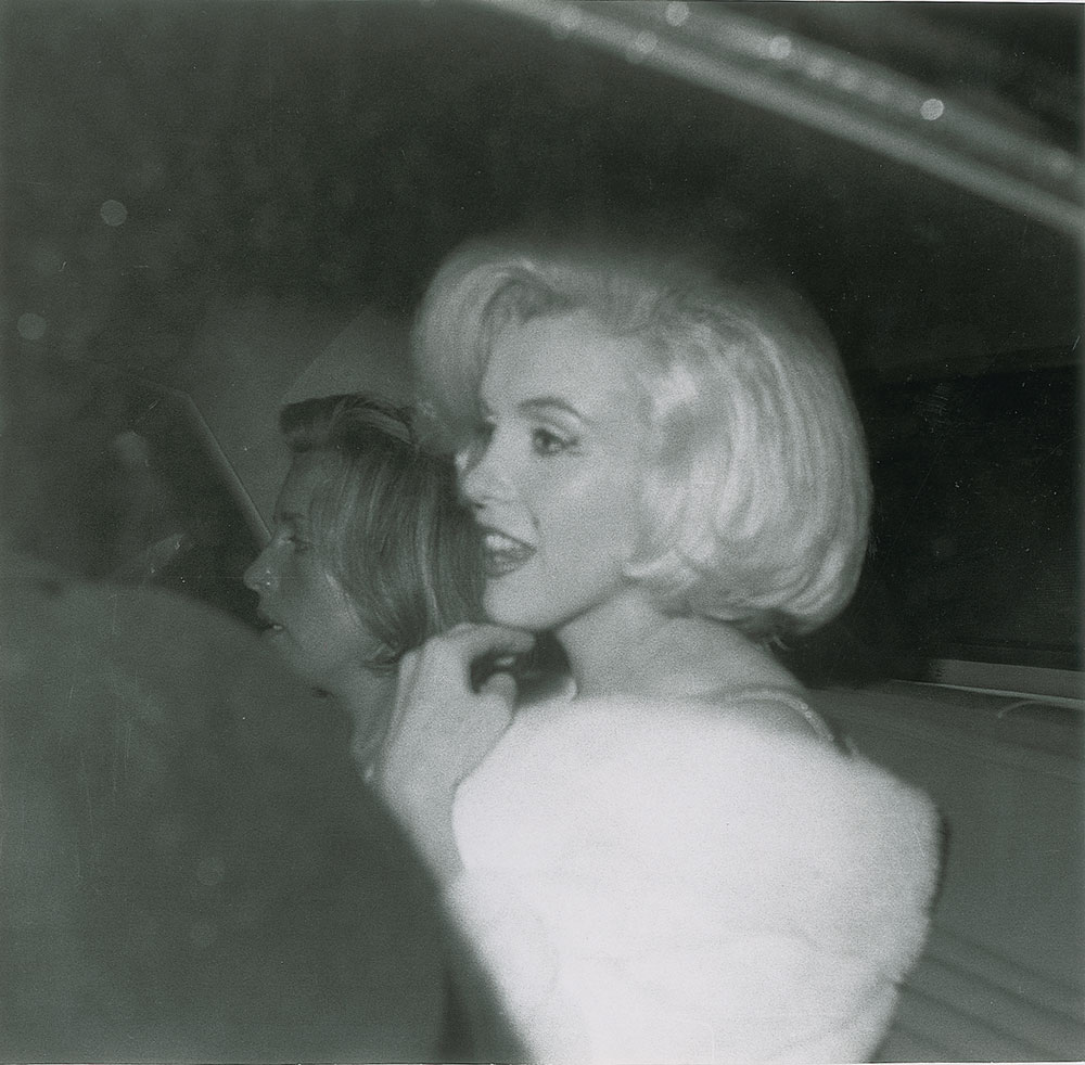 Original vintage glossy 7.75 x 7.5 silver gelatin photo of Marilyn Monroe in her white fur shawl at Madison Square Garden on May 19, 1962, for John F. Kennedy's 45th birthday celebration, where she famously serenaded him with 'Happy Birthday, Mr. President.' In fine condition, with trimmed edges and minor surface spotting.