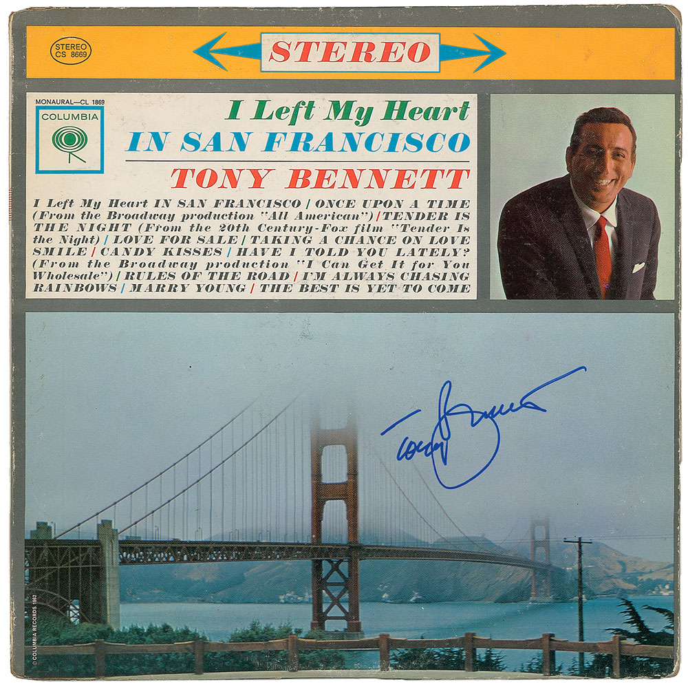 I Left My Heart in San Francisco album signed on the front cover in blue felt tip by Tony Bennett. In fine condition, with wear and partial splits to edges. The record is included. Accompanied by a John Brennan Collection letter of provenance. From The John Brennan In-person Autograph Collection.