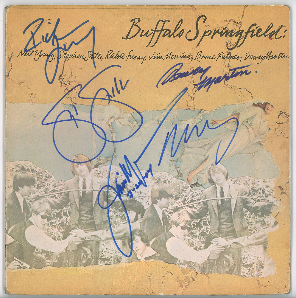 Self-titled compilation album from Buffalo Springfield, signed on the front cover in blue felt tip by Neil Young, Stephen Stills, Richie Furay, Jim Messina, and Dewey Martin. In fine condition, with partial separations to edges. The records are included. Accompanied by a John Brennan Collection letter of provenance. From The John Brennan In-person Autograph Collection.
