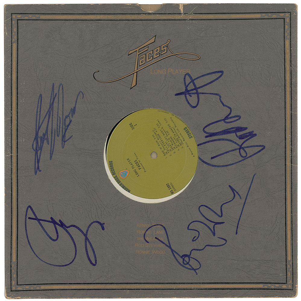 Long Player album by Faces, signed on the front cover in blue felt tip by Ian McLagan, Rod Stewart, Kenney Jones, and Ronnie Wood. In fine condition, with a short tear to the top edge. The record is included. Accompanied by a John Brennan Collection letter of provenance. From The John Brennan In-person Autograph Collection.