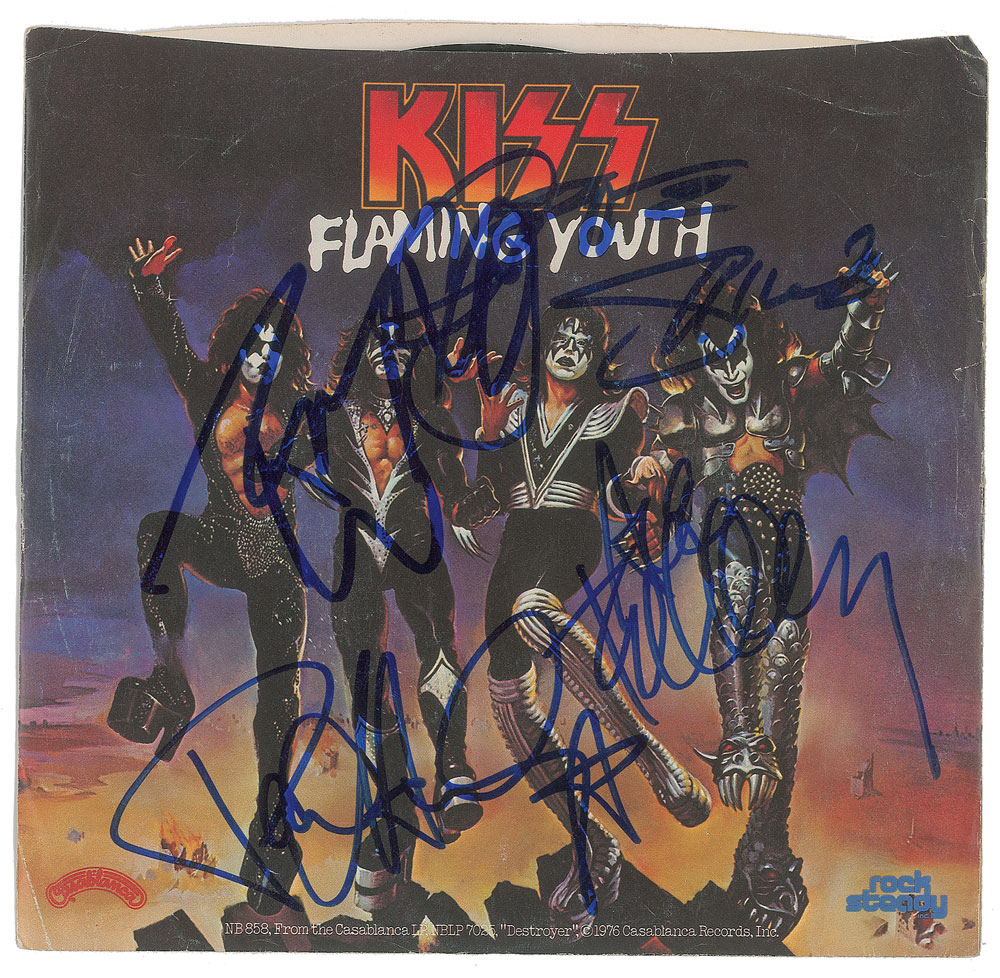 Casablanca Records 45 RPM single for 'Flaming Youth / God of Thunder' by KISS, signed on the front cover in blue felt tip by Paul Stanley, Ace Frehley, Gene Simmons, and Peter Criss. In fine condition, with light creasing. The record is included. Accompanied by a John Brennan Collection letter of provenance. From The John Brennan In-person Autograph Collection.