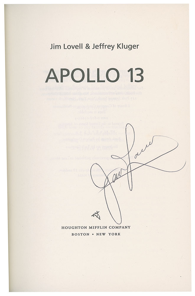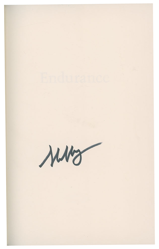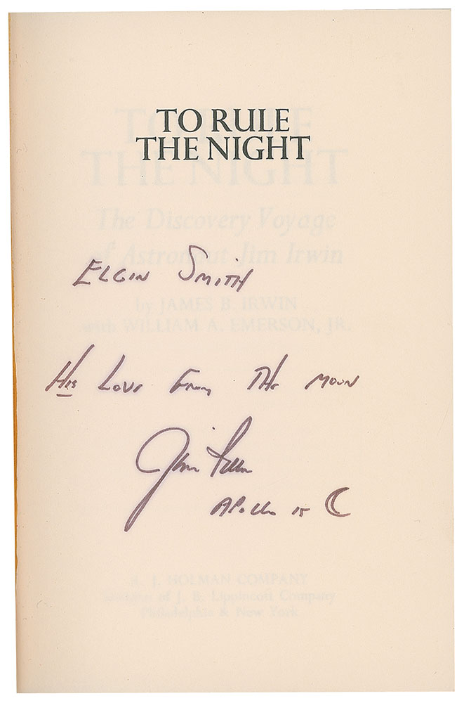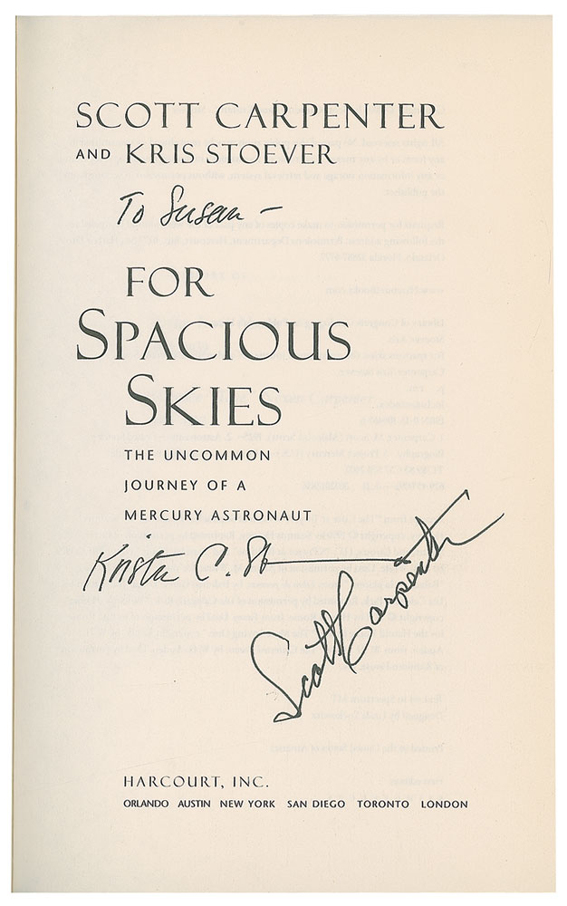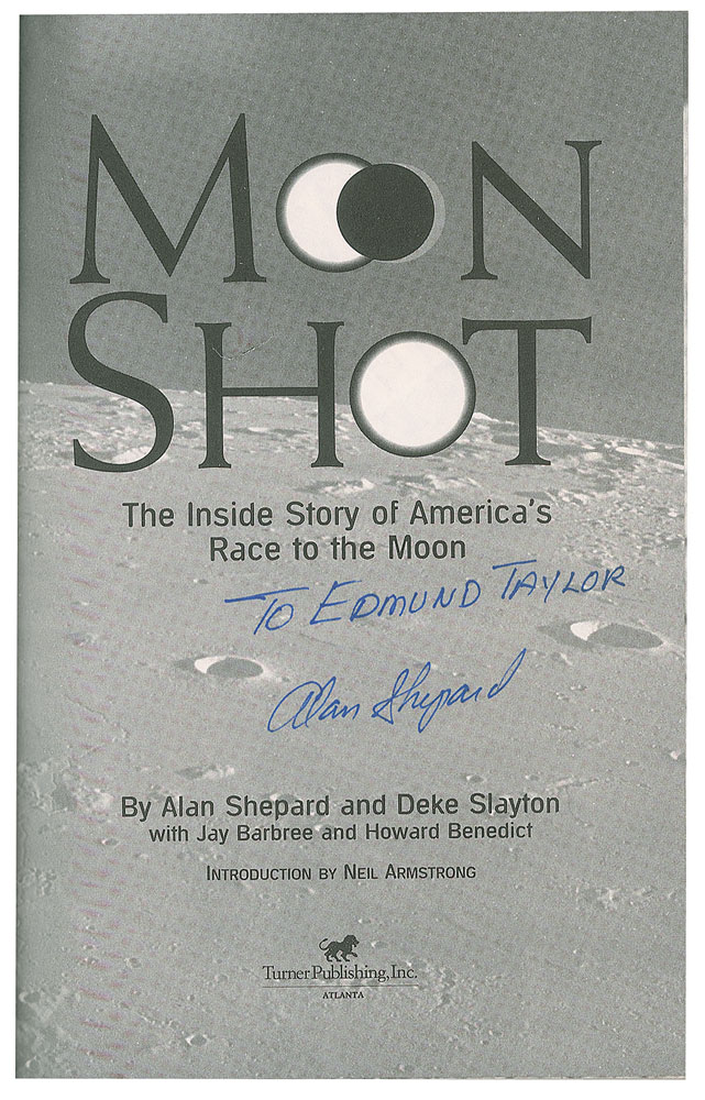 Six books signed by astronauts, all hardcovers with dust jackets, including: Jim Irwin (To Rule the Night, inscribed), Jim Lovell (Apollo 13), Alan Shepard (Moon Shot, inscribed), Scott Carpenter (For Spacious Skies, also inscribed by co-author Kris Stoever), Tom Stafford (We Have Capture), and Scott Kelly (Endurance). In overall very good to fine condition, with tears to the Irwin dust jacket, and a heavy dent to the Shepard cover resulting in tears to a couple dozen of the beginning pages, including the signed page; the Lovell and Shepard dust jackets also have "Autographed Copy" labels applied to the dust jackets.