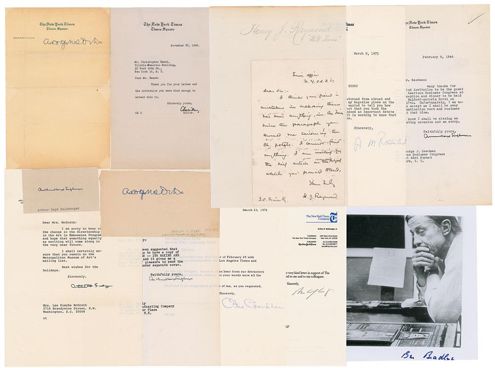 Collection of 12 items signed by newspaper publishers, editors, and journalists, including: Adolph S. Ochs (two signatures), Arthur Hays Sulzberger (signature and two TLSs), Arthur O. Sulzberger, Sr. (TLS), Arthur O. Sulzberger, Jr. (TLS), Henry Jarvis Raymond (ALS), Charles Merz (TLS), A. M. Rosenthal (TLS), Ben Bradlee (SP), and Otis Chandler (TLS). In overall very good to fine condition.
