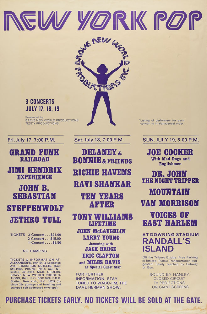 Scarce original 23 x 35 poster for the New York Pop Festival held at Downing Stadium on Randalls Island on July 17-19, 1970, which lists the festival's roster of big name musical acts, such as: the Jimi Hendrix Experience, Grand Funk Railroad, Jethro Tull, Joe Cocker, Van Morrison, Steppenwolf, Richie Havens, Ten Years After, Mountain, Ravi Shankar, and The Tony Williams Lifetime, who will be joined on stage by Jack Bruce, Eric Clapton, and special guest star Miles Davis. Lower border features ticket and venue information, with bold text: "Purchase Tickets Early. No Tickets Will Be Sold At The Gate." In fine condition, with dampstaining along the bottom edge. After the triumph of Woodstock the previous year, the three-day New York Pop Festival tried to re-create its success in New York City. Unfortunately, the concert proved a bust as half of the star-studded lineup failed to show up and thousands of fans earned free entry when they literally crashed through the perimeter fencing. One of the handful of highlights from the festival was the rousing performance by the Jimi Hendrix Experience.
