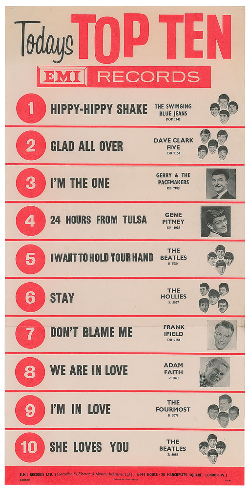 Vintage EMI Records promotional poster, 10 x 20, which is headed, “Todays Top Ten, EMI Records,” and charts the label’s current top 10 singles from 1964, with the Beatles appearing at the No. 5 and 10 spots with ‘I Want to Hold Your Hand’ and ‘She Loves You.’ Other notable acts include The Swinging Blue Jeans, the Dave Clark Five, Gerry & the Pacemakers, and the Hollies. In fine, folded condition. Accompanied by a certificate of authenticity from Tracks.