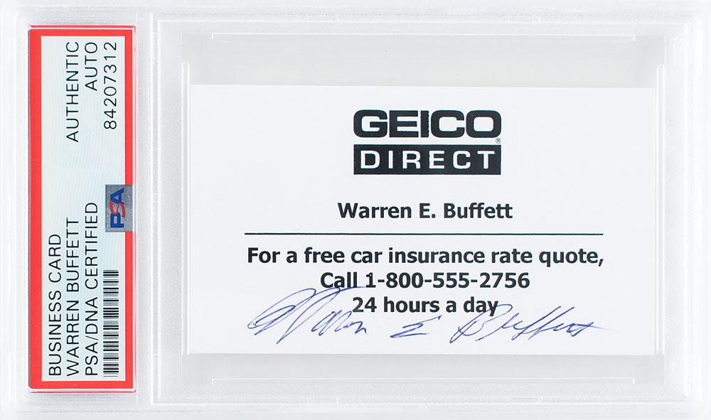 Souvenir Geico Direct business card printed with Buffett's name and a toll free number, 3.5 x 2, signed in blue ballpoint, "Warren E. Buffett." In fine condition. Encapsulated in a PSA/DNA authentication holder.