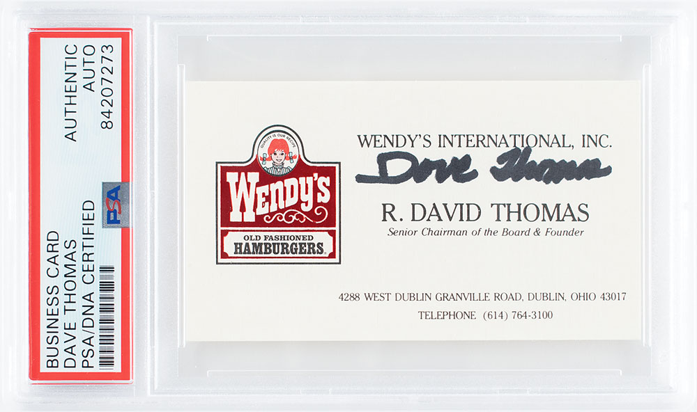 Wendy's International, Inc. business card belonging to Dave Thomas, 3.5 x 2, which identifies him as "Senior Chairman of the Board & Founder," signed in black felt tip. In fine condition. Encapsulated in a PSA/DNA authentication holder.