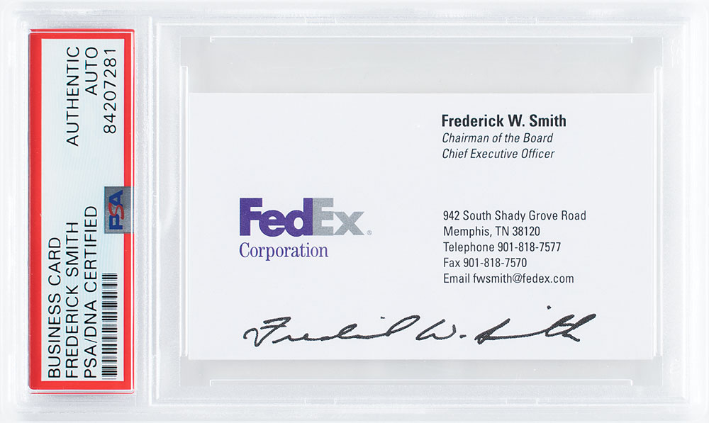 FedEx Corporation business card belonging to Frederick W. Smith, 3.5 x 2, which identifies him as "Chairman of the Board, Chief Executive Officer," signed in black ink. In fine condition. Encapsulated in a PSA/DNA authentication holder.