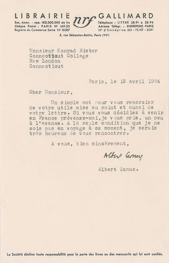 TLS in French, one page, 5.5 x 8.5, Librarie Gallimard letterhead, April 12, 1954. Letter to Konrad Bieber, in full (translated): "Just a brief word to thank you for the explanation. Should you decide to come to France, let me know in advance. Unless I am away travelling at that moment, I would be very glad to make your acquaintance." In fine condition, with staple holes to the top.