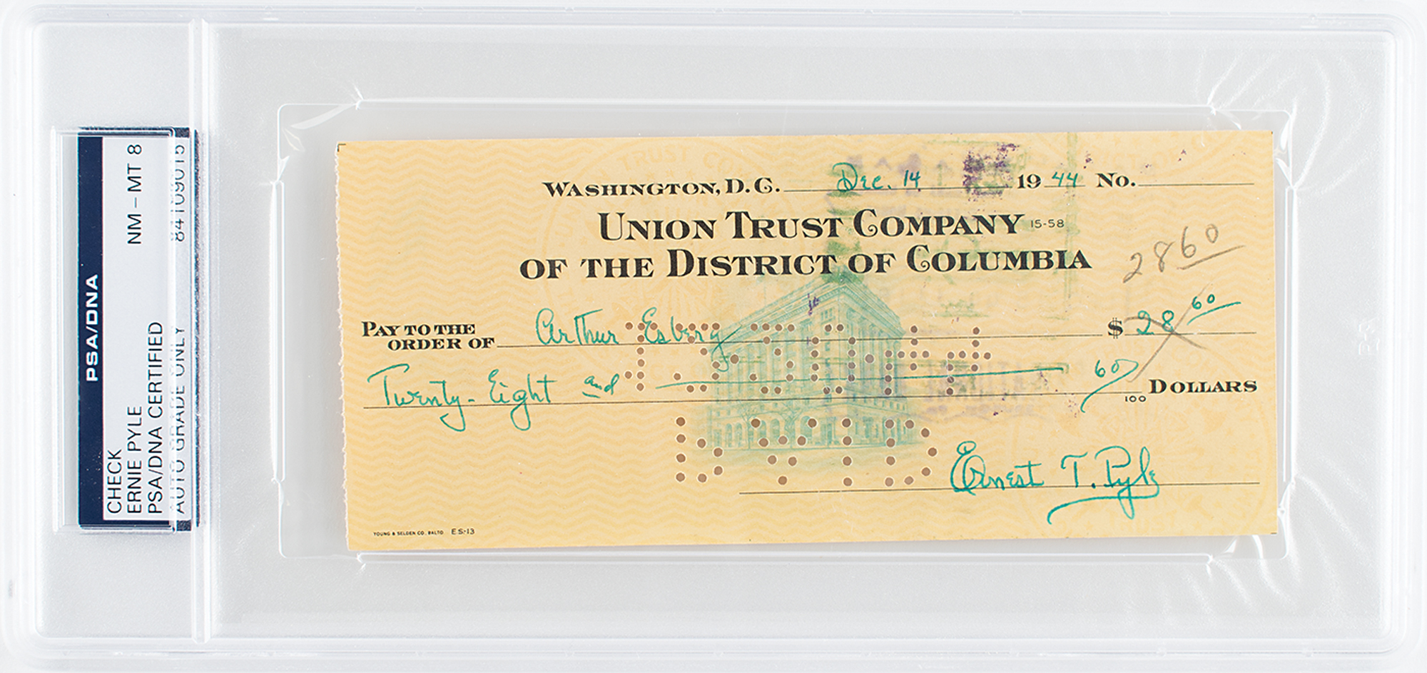 Union Trust Company of the District of Columbia check, 6.25 x 2.75, filled out and signed by Pyle, "Ernest T. Pyle," payable to Arthur Esberg for $28.60, December 14, 1944. In fine condition. Encapsulated in a plastic PSA/DNA authentication and grading holder, evaluating the autograph as "NM-MT 8."