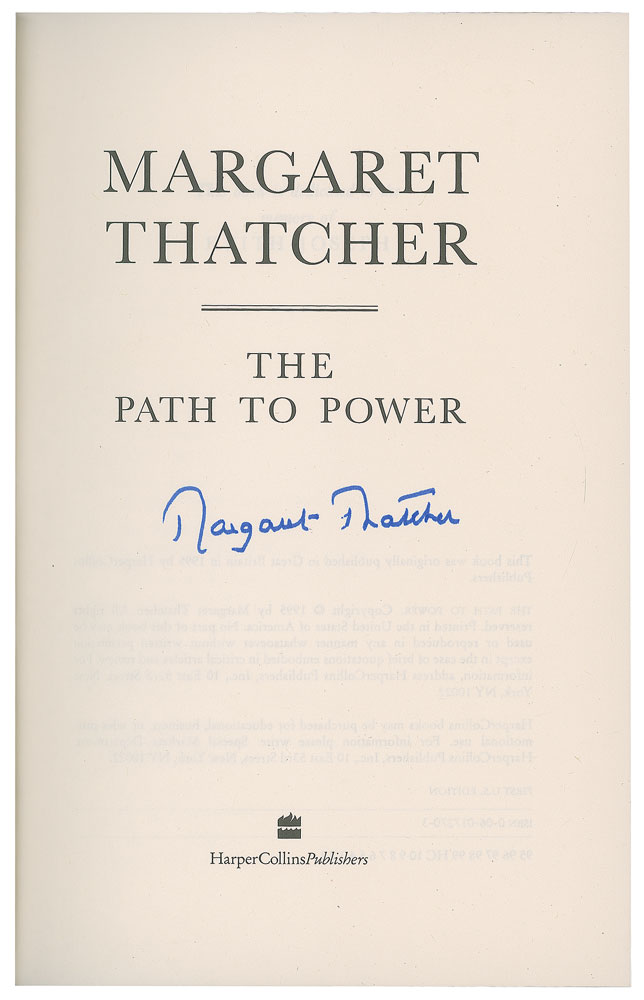 Signed book: The Path to Power. First U.S. edition. NY: HarperCollins, 1995. Hardcover with dust jacket, 6.5 x 9.5, 656 pages. Signed on the title page in blue felt tip by Margaret Thatcher. In fine condition.