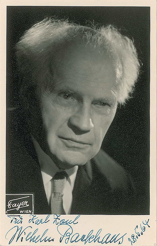 German pianist (1884-1969) known for his interpretations of Beethoven and Brahms. Vintage matte-finish 3.5 x 5.5 portrait of the German pianist by the Fayer Studio of Vienna, signed and inscribed in the lower border in fountain pen, “For Karl Zoul, Wilhelm Backhaus, 28.5.64.” Reverse bears the studio stamp. In fine condition.