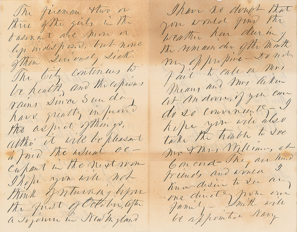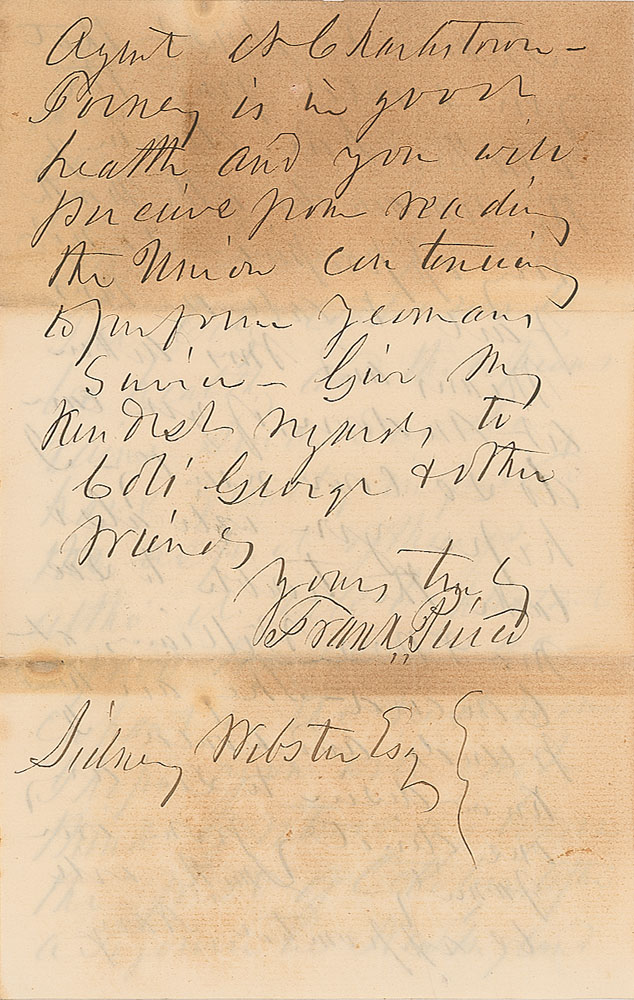 ALS as president signed “Frank. Pierce,” four pages on two adjoining sheets, 5 x 7.75, September 14, 1854. Letter to his secretary Sydney Webster, in full: "I believe Mrs. Pierce wrote you a few lines the day after our return. I have no idea where this is likely to find you but I hope at some pleasant place with agreeable surroundings and in good health. The fireman & two or three of the girls in the basement are more or less indisposed but none of them seriously sick. The city continues to be healthy and the copious rains since Sunday have greatly improved the aspect of things, altho' it will be pleasant to find the usual occupant in the next room. I hope you will not think of returning before the first of October, after a sojourn in New England. I have no doubt that you would find the weather here during the remainder of the month very oppressive—Do not fail to call on Mrs. Means and Mrs. Aiken at Andover if you can do so conveniently—I hope you will also take the trouble to see Mr. & Mrs. Williams at Concord—They are kind friends and would I know desire to see anyone directly from our family—Smith will be appointed Navy Agent at Charlestown—Forney is in good health and you will perceive from reading the Union continuing to perform yeoman service—give my kindest regards to Colo. George & other friends." In very good condition, with overall irregular toning.