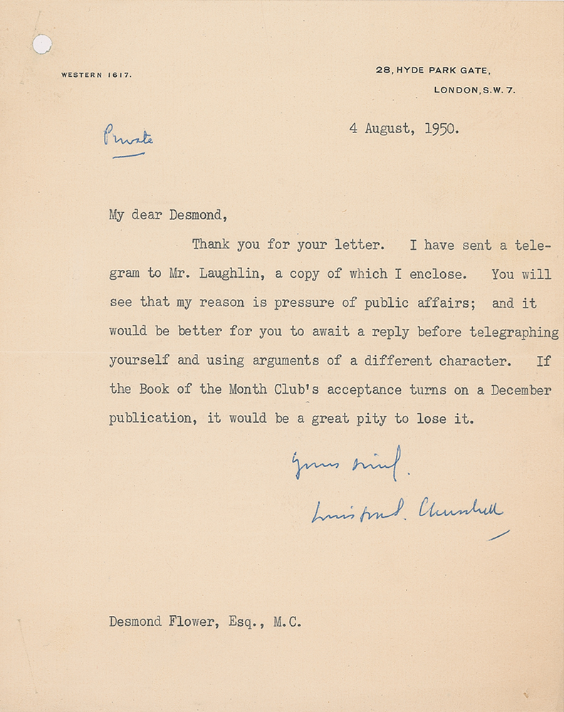 TLS signed “Yours sinc'ly, Winston S. Churchill,” one page, 7.5 x 9.5, Hyde Park Gate letterhead, August 4, 1950. Letter to editor and publisher Desmond Flower, in full: "Thank you for your letter. I have sent a telegram to Mr. Laughlin, a copy of which I enclose. You will see that my reason is pressure of public affairs; and it would be better for you to await a reply before telegraphing yourself and using arguments of a different character. If the Book of the Month Club's acceptance turns on a December publication, it would be a great pity to lose it." Churchill has marked the letter "Private" in his own hand. In fine condition.