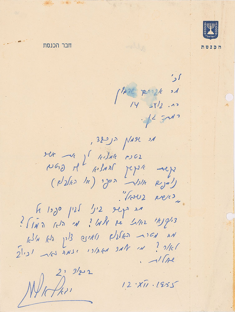 Israeli politician (1918-1980) who was a commander of the Palmach and a general in the IDF. He also served as one of the leaders of Ahdut HaAvoda party and the Israeli Labor party, and was for a period the acting Prime Minister of Israel. ALS in Hebrew, one page, 6.25 x 8.25, The Knesset letterhead, December 12, 1955. Letter to Avraham Shadmon, in part (translated): "Before I provide to you what you have requested, I will ask you to supply additional details about the book (or the album) 'Personalities in Israel.' What is the connection between it and the book by the profile writer of the same name?? Who is the publisher? What is the purpose of the album and what is the reason for its publication? Who is behind this initiative and so on??" In very good to fine condition, with light creasing, a bit of edge staining, two file holes, and dampstaining to several words of text.