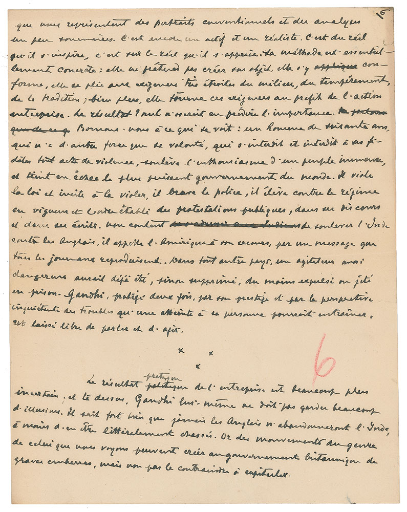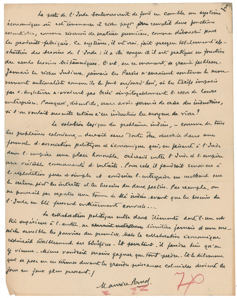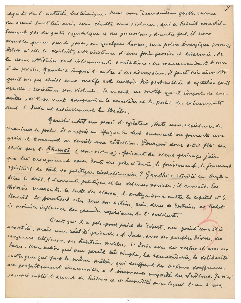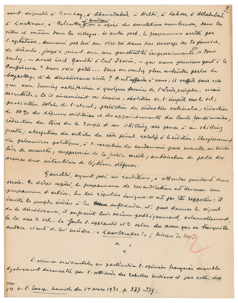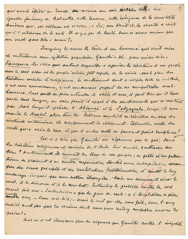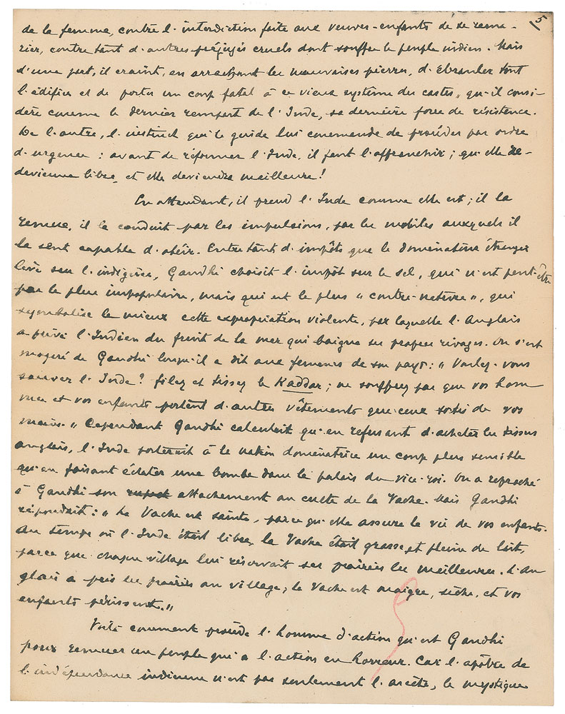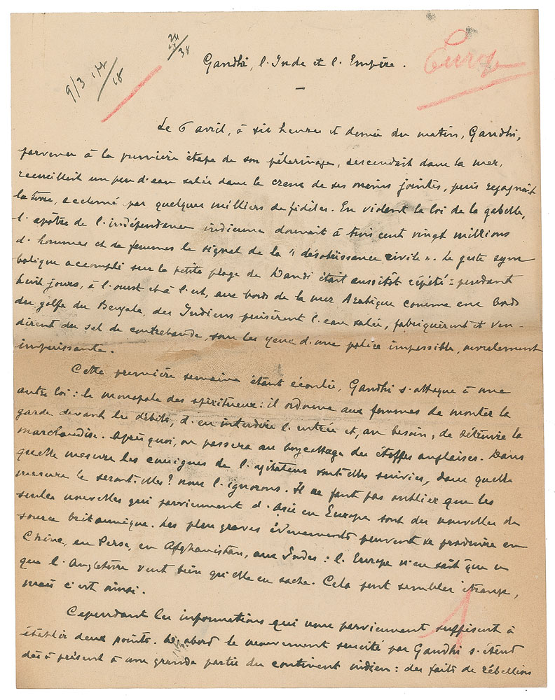 French journalist (1875-1948) who specialized in foreign affairs. Autograph manuscript in French, signed "Marucei Pernot," seven pages, 8.25 x 10.5, circa 1930. An untranslated article entitled "Gandhi, l'Inde et l'Empire," discussing Mohandas Gandhi's non-violent protest against the salt tax with the Salt March, the social condition of the 'untouchables' and women in India, English fabrics, and global opinion. In small part (translated): "Why did he choose his choice of Ahimsa (non-violence)? It is because he took as his starting point, not an abstract idea, but a present reality, India with its diverse peoples, its religious beliefs, its social traditions, India with its virtues and with its faults?He is still an active and a realist. inspires, it is on reality that it is based?The result? No one would dare to predict its importance?The logical solution of the Indian problem—as of all colonial problems—should undoubtedly be sought in a formula of political and economic association." In fine condition.