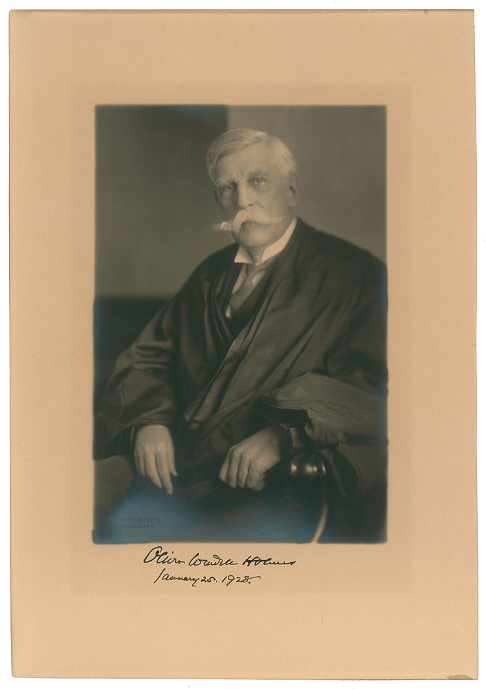 Excellent vintage matte-finish 9.5 x 13.75 portrait of Justice Holmes in his judicial robe by the Harris & Ewing Studio, signed below in fountain pen, "Oliver Wendell Holmes, January 25, 1928." Lower left of image bears the studio blindstamp. In very good to fine condition, with two creases in the borders.