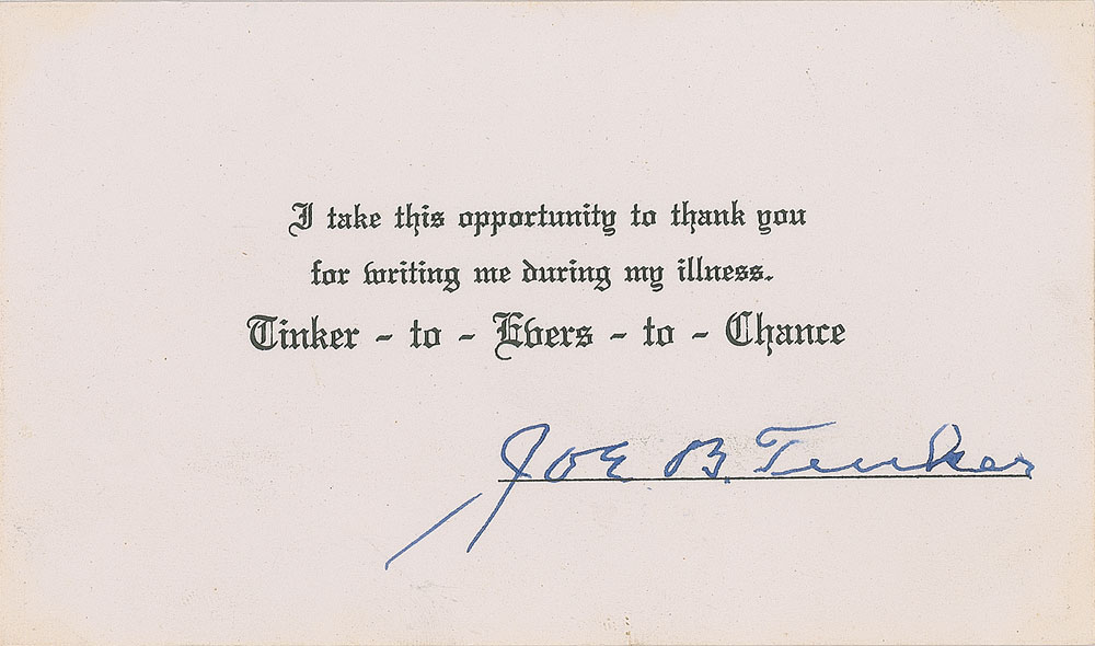 Uncommon vintage fountain pen signature, "Joe B. Tinker,” on an off-white 5.5 x 3.25 card imprinted with a thank-you message and the Cubs' famed double-play call: "I take this opportunity to thank you for writing me during my illness. Tinker - to - Evers - to - Chance." In very fine condition. From the James A. Bowman Collection.