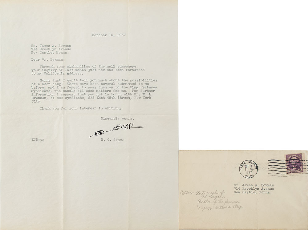 TLS, one page, 8.5 x 11, October 15, 1937. Letter to James A. Bowman, in part: "Sorry that I can't tell you much about the possibilities of a Goon song. There have been several submitted to me before, and I am forced to pass them on to the King Features Syndicate, who handle all such matters for me." In fine condition. Accompanied by the original mailing envelope. From the James A. Bowman Collection.