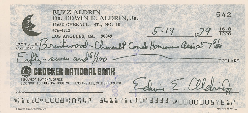 Personal check, 6 x 2.75, filled out and signed by Aldrin, "Edwin E. Aldrin, Jr.," payable to Brentwood-Chenault Condo Homeowners Ass'n for $57.61, May 14, 1979. In fine condition.