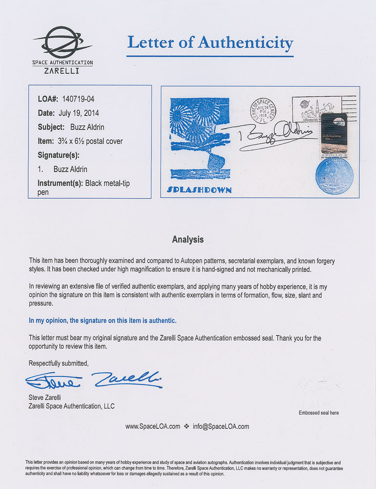 Apollo 11 recovery cover with a stamped cachet honoring the splashdown, postmarked at Kennedy Space Center on July 24, 1969, signed in black felt tip by Buzz Aldrin. In fine condition. Accompanied by a full letter of authenticity from Zarelli Space Authentication.