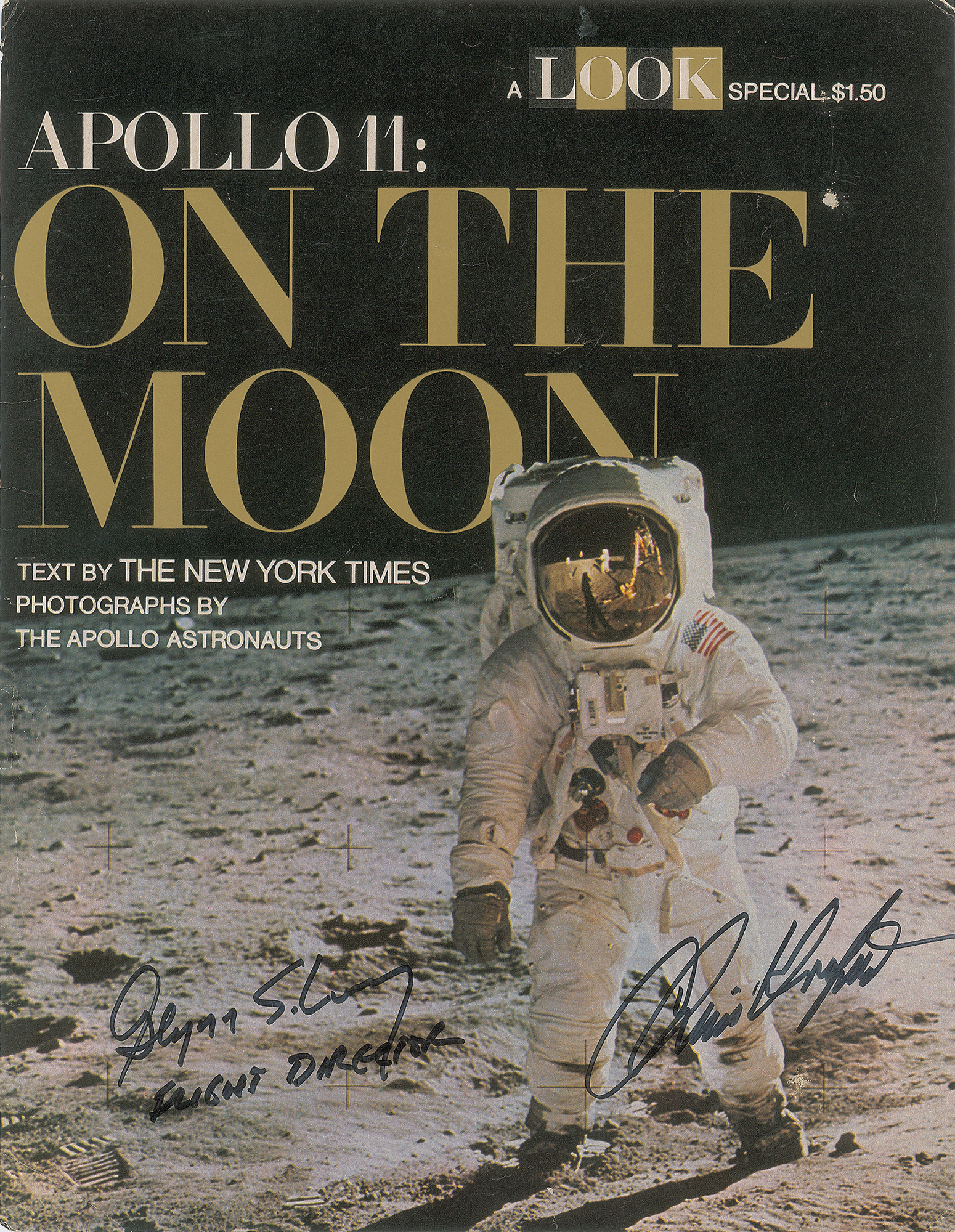 Two oversized items: a color 10 x 13 LOOK Magazine cover from 1969 featuring the iconic Apollo 11 'visor shot,' signed in black felt tip by the flight directors, "Glynn S. Lunney, Flight Director" and "Chris Kraft"; and a color 9.25 x 11.25 magazine page featuring the same image of Aldrin on the lunar surface, signed in black felt tip, "Chris Kraft." In overall very good to fine condition, with a few small creases and edge tears.