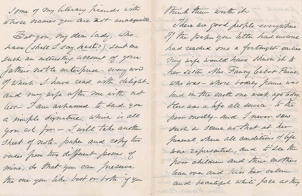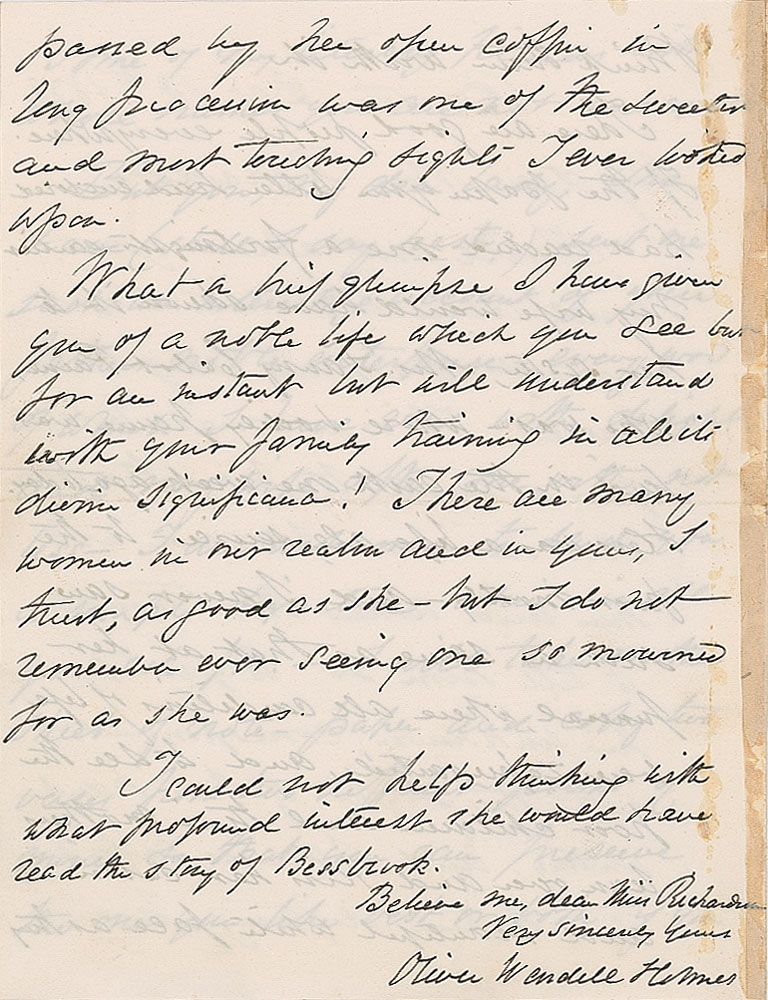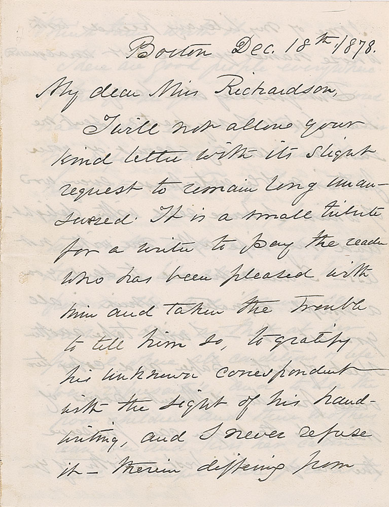 ALS signed “Oliver Wendell Holmes,” four pages on two adjoining sheets, 4.5 x 5.75, December 18, 1878. Letter to Miss Richardson, in part: "It is a small tribute for a writer to pay the reader who has been pleased with him and taken the trouble to tell him so, to gratify his unknown correspondent with the sight of his handwriting, and I never refuse it—therein differing from some of my literary friends with whose names you are not unacquainted?There are good people everywhere. If the paper your letter had enclosed had reached me a fortnight earlier my wife would have shown it to her sister, Mrs. Fanny Cabot Paine, who was—whose bodily frame was laid in the earth one week ago today?I could not help thinking with what profound interest she would have read the story of Bessbrook." In fine condition, with old mounting remnants along the right edge of the last page.