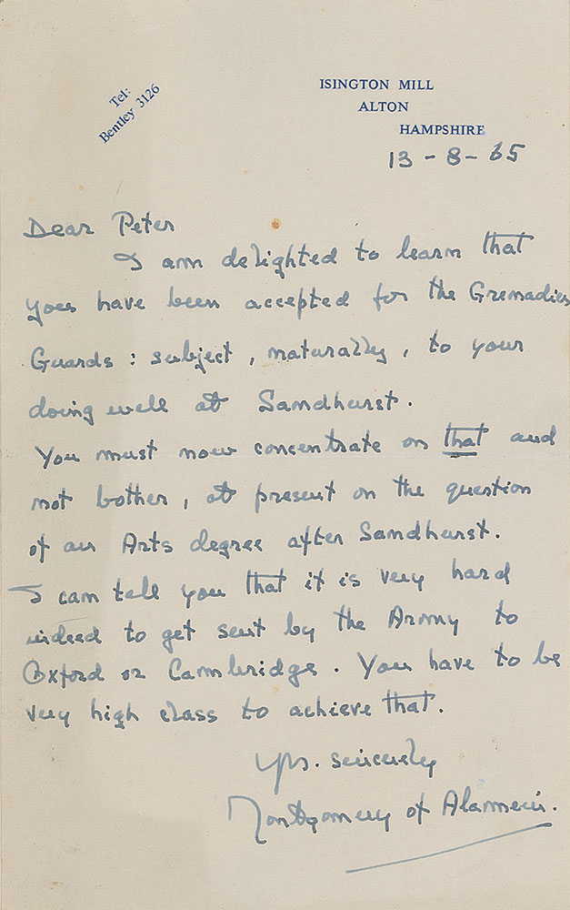 ALS, one page, 5 x 8, Isington Mill letterhead, August 13, 1965. Letter to "Peter," in full: "I am delighted to learn that you have been accepted for the Grenadier Guards: subject, naturally, to your doing well at Sandhurst. You must concentrate on that and not bother, at present on the question of an Arts degree after Sandhurst. I can tell you that it is very hard indeed to get sent by the Army to Oxford or Cambridge. You have to be very high class to achieve that." In very good to fine condition, with scattered light creasing.