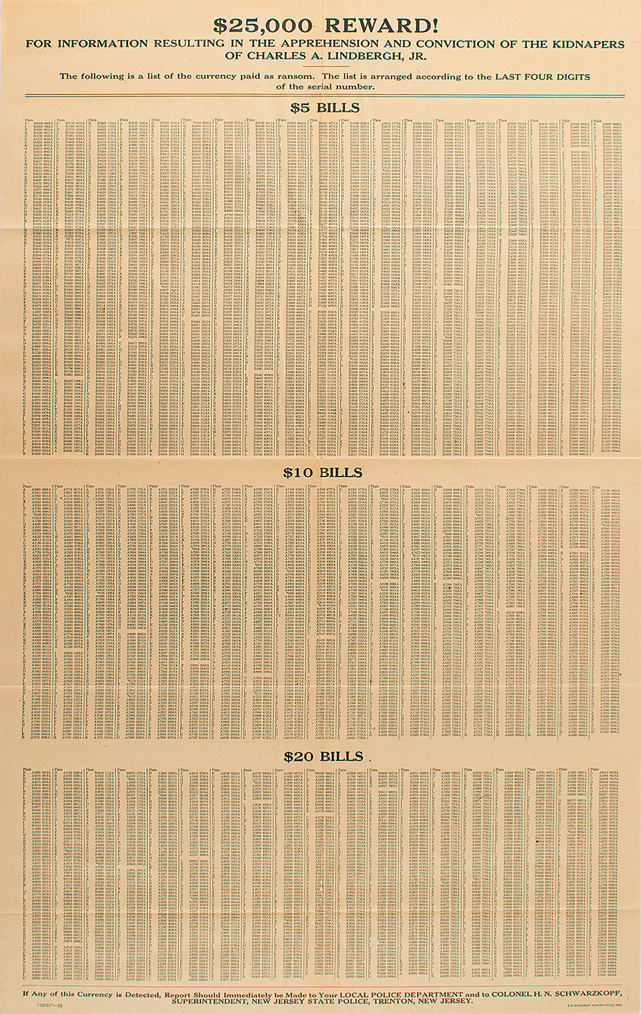 Uncommon reward poster offering $25,000 for "information resulting in the apprehension and conviction of the kidnappers of Charles A. Lindbergh, Jr.," 17 x 27, listing numerous serial numbers of the 5, 10, and 20 dollar bills used in the $50,000 ransom payment. Poster requests that any detected currency be communicated to the local police and Col. H. Norman Schwarzkopf. In fine condition, with splitting to the top of the vertical fold.