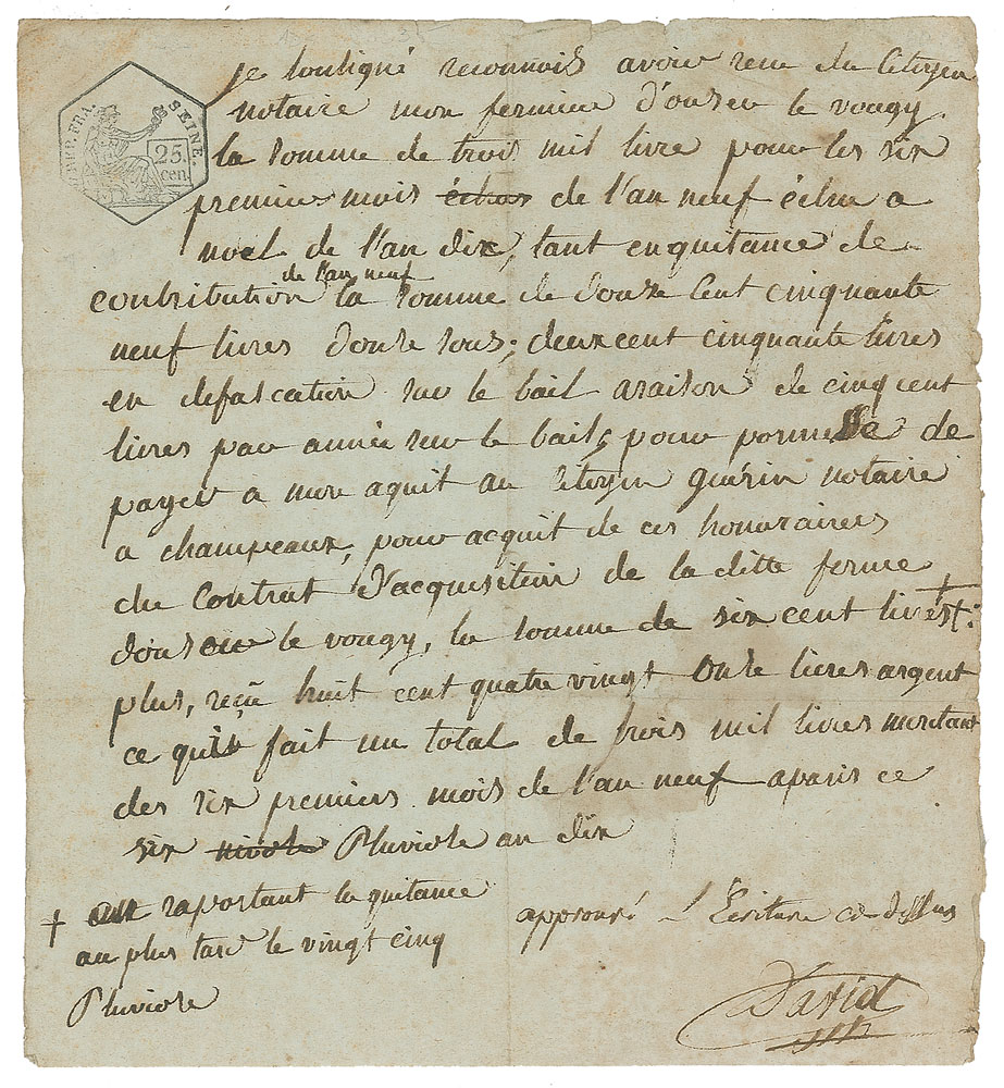 French painter (1748-1825) and master of the Neoclassical style whose most famous works include 'The Death of Marat' and several portraits of Napoleon Bonaparte. Scarce manuscript DS in French, signed “David,” one page, 7 x 7.75, no date. An untranslated document endorsed at the conclusion by Jacques-Louis David. In very good condition, with light staining and soiling.
