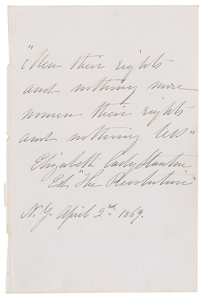 Pioneering feminist (1815-1902) who, at the first women's rights convention in Seneca Falls, New York, in 1848, presented her 'Declaration of Sentiments,' outlining her view of the rights and aims of American women and contributing in no small part to the adoption of women's suffrage more than half a century later. AQS on an off-white 5 x 7.5 book page, in full: "'Men their rights and nothing more, women their rights and nothing less,' Elizabeth Cady Stanton, Ed. 'The Revolution,' N. Y. April 2nd, 1869." In fine condition.