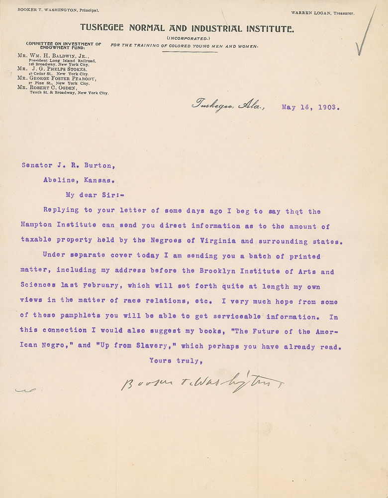 TLS, one page, 8.75 x 11, Tuskegee Normal and Industrial Institute letterhead, May 16, 1903. Letter to Kansas Senator Joseph R. Burton, in part: "I beg to say that the Hampton Institute can send you direct information as to the amount of taxable property held by the Negroes of Virginia and surrounding states. Under separate cover today I am sending you a batch of printed matter, including my address before the Brooklyn Institute of Arts and Sciences last February, which will set forth quite at length my own views in the matter of race relations, etc?In this connection I would also suggest my books, 'The Future of the American Negro,' and 'Up from Slavery,' which perhaps you have already read." In fine condition.